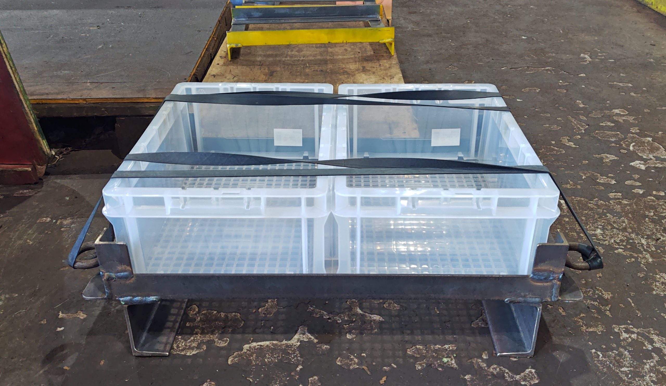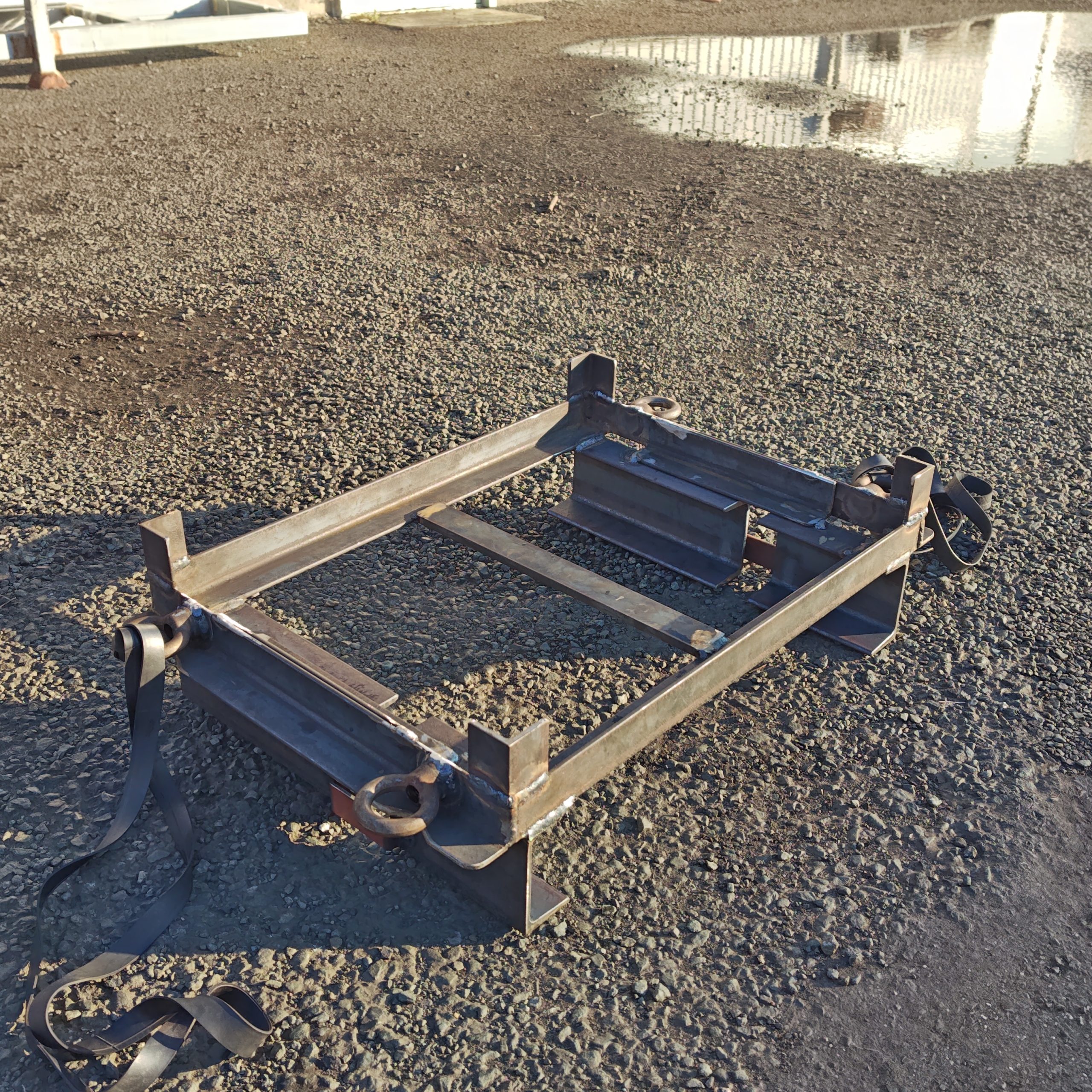 フォークリフトでこの架台ごと載せ下ろしができるようにしたい、との思いで製作をしました。